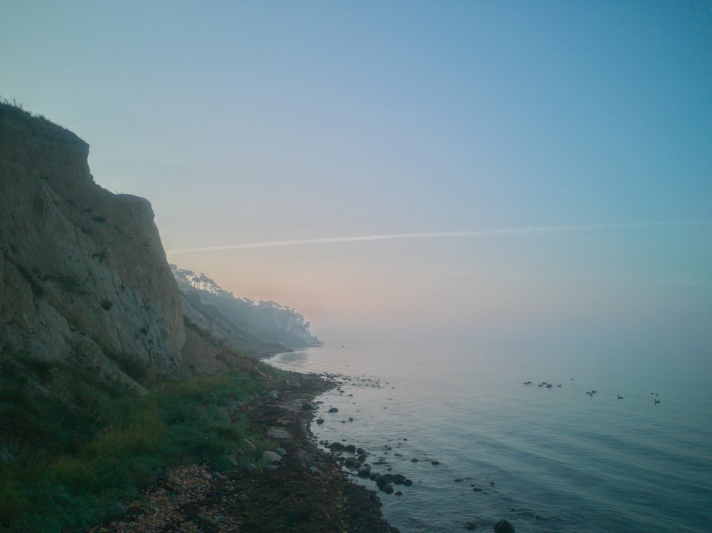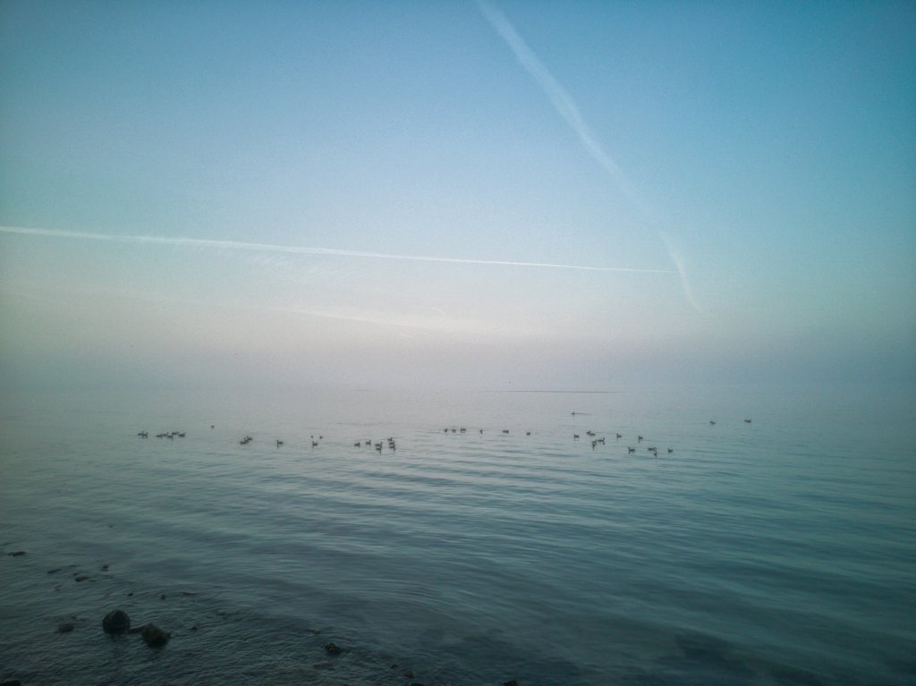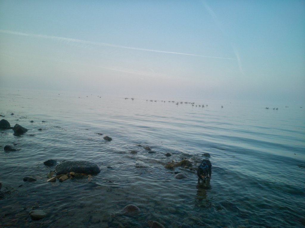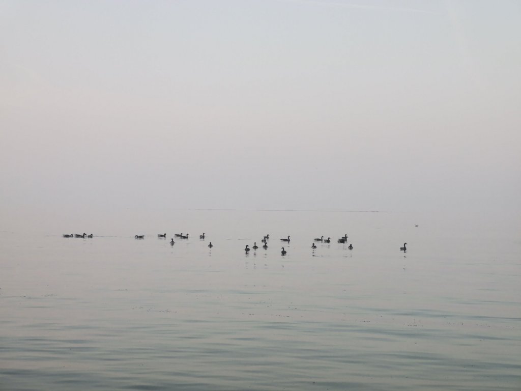 One morning was especially beautiful, because we arrived at the time when the fog was slowly lifting, but did still lingered over the sea. A flock of Canadian geese were resting on the water. Peace and beauty mingled together as the sea and sky were not possible to tell apart.