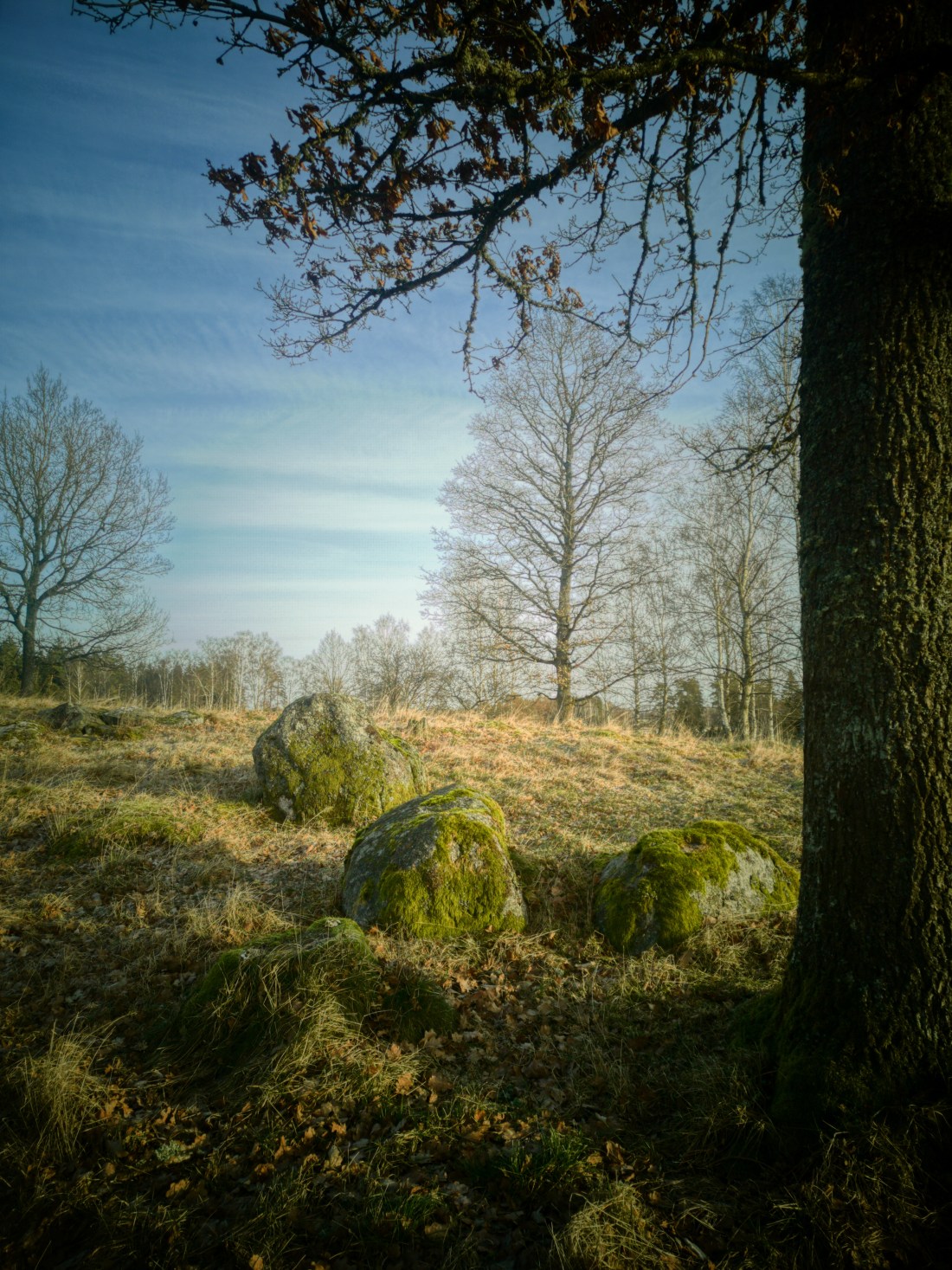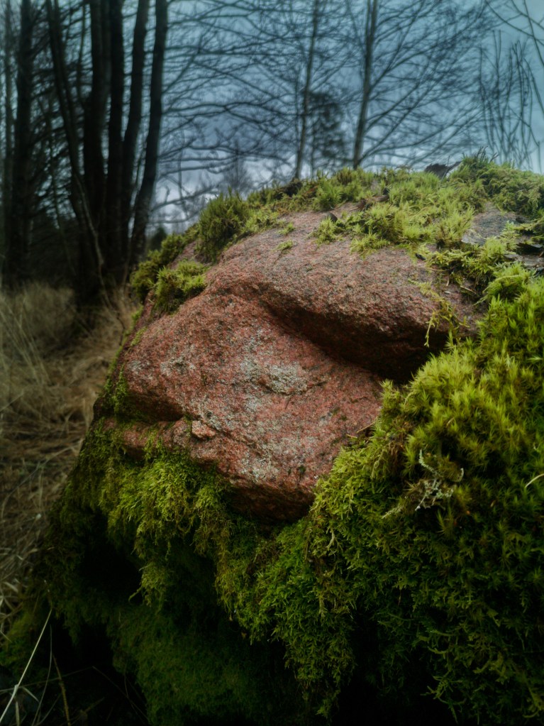 I have walked this trail for several years, but it always gives me new small surprises, as today. I passed a stone and I noticed the beautiful nuance of the red granit contrasted by the green moss that partly covered it. I kneeled down to catch it on camera. Suddenly I saw not a stone but an old man with green beard. He looked a little stern as if he was, against all odds, determined to stay there for some hundreds years more.