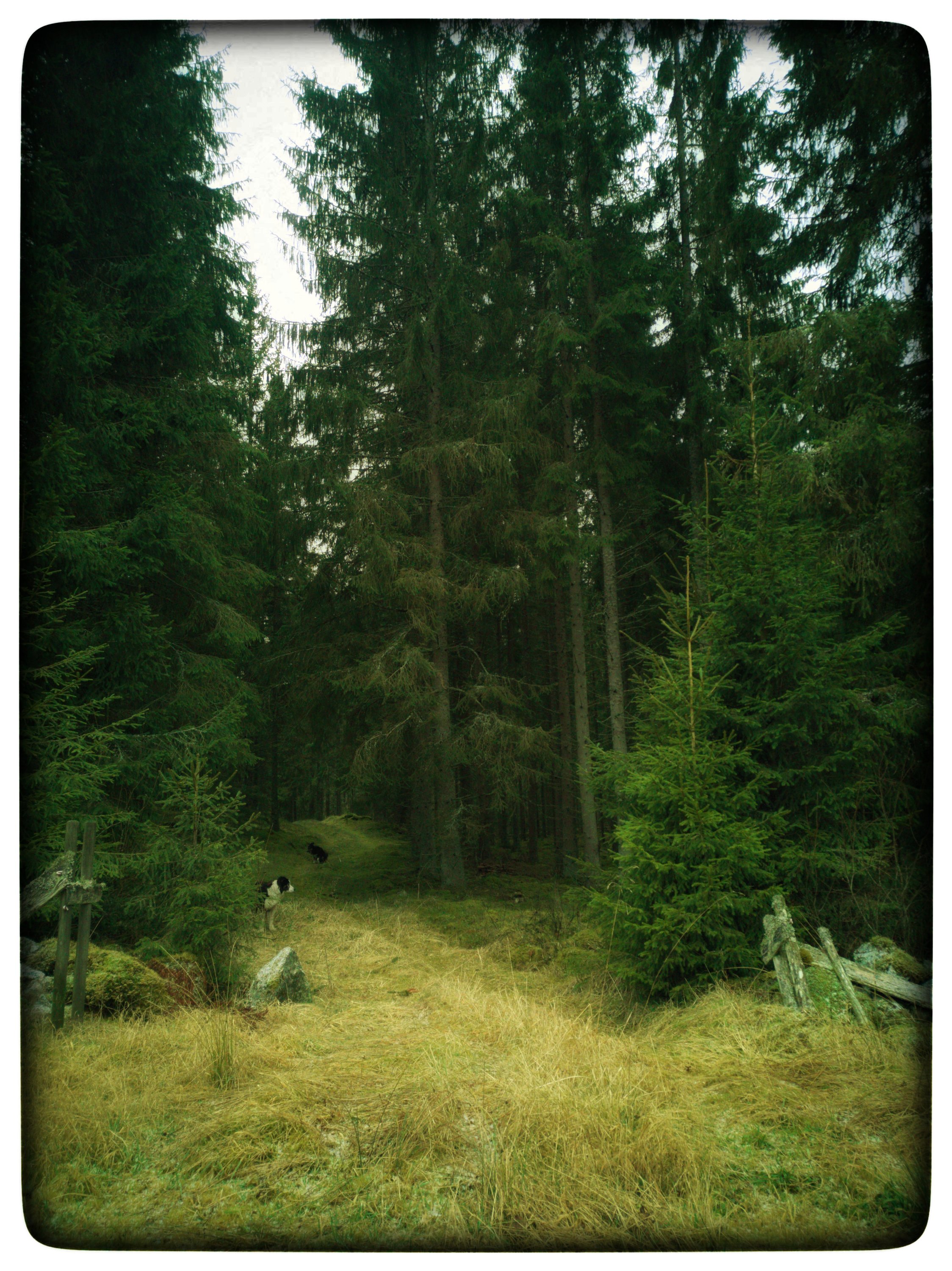 I was out walking in the forest quite far from home last Sunday. It is an old forest partly planted and partly old natural fir forest. The moss is thick and the firs are sparse and tall. There is something wondrous about old fir forests. The trees makes a soft soughing sound unlike many trees. The whisper above you, the dusk around you, and the different species of moss under you. It’s difficult not to just lie down watching the tree tops sawying and whispering. At the same time just to walk through it is simply lovely. To discover new traces of wood peckers in the anthills, finding new narrow animal paths, and to follow old overgrown forest roads.