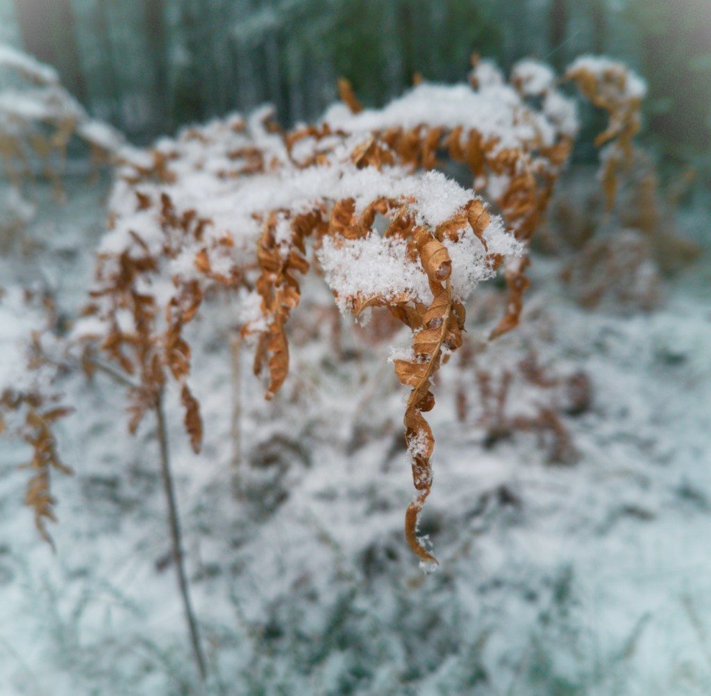In the woods apart from the maturated emerald colour of the firs, the ferns are my favourites. It is something in their light brown colour that is so beautifully contrasted with the snow which causes me to stop and just watch and ponder.